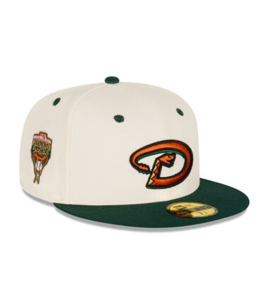 Esta gorra New Era 59FIFTY de Arizona Diamondbacks de la colección MLB Rusty Chrome presenta un diseño two tone con la corona blanca y el logotipo de los Diamondbacks bordado en los paneles frontales, un parche conmemorativo, visera verde, y el flag de New Era bordado en el lado izquierdo.
