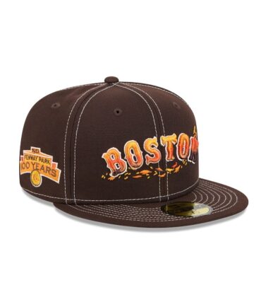 Esta gorra plana New Era 59FIFTY de Boston Red Sox de la colección MLB Fall Foliage presenta un diseño inspirado en la estación de otoño con el nombre de la ciudad de los Red Sox bordado en los paneles frontales, un parche conmemorativo del lado derecho, el MLB Batterman al