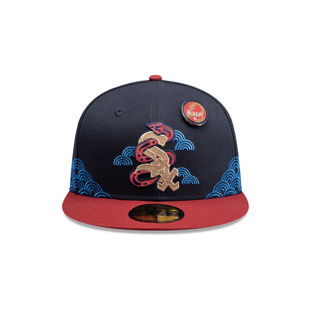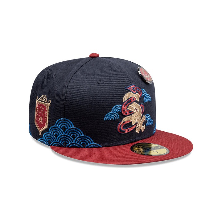 Esta gorra plana New Era 59FIFTY de Chicago White Sox de la colección Lunar New Year presenta el logotipo de los White Sox con una serpiente entrelazada bordada en los paneles frontales acompañado de un pin alusivo al Año de la Serpiente, un parche con caracteres chinos que hacen referencia al equipo del lado derecho, el logo del equipo y el MLB Batterman al reverso y el flag de New Era bordado del lado izquierdo.