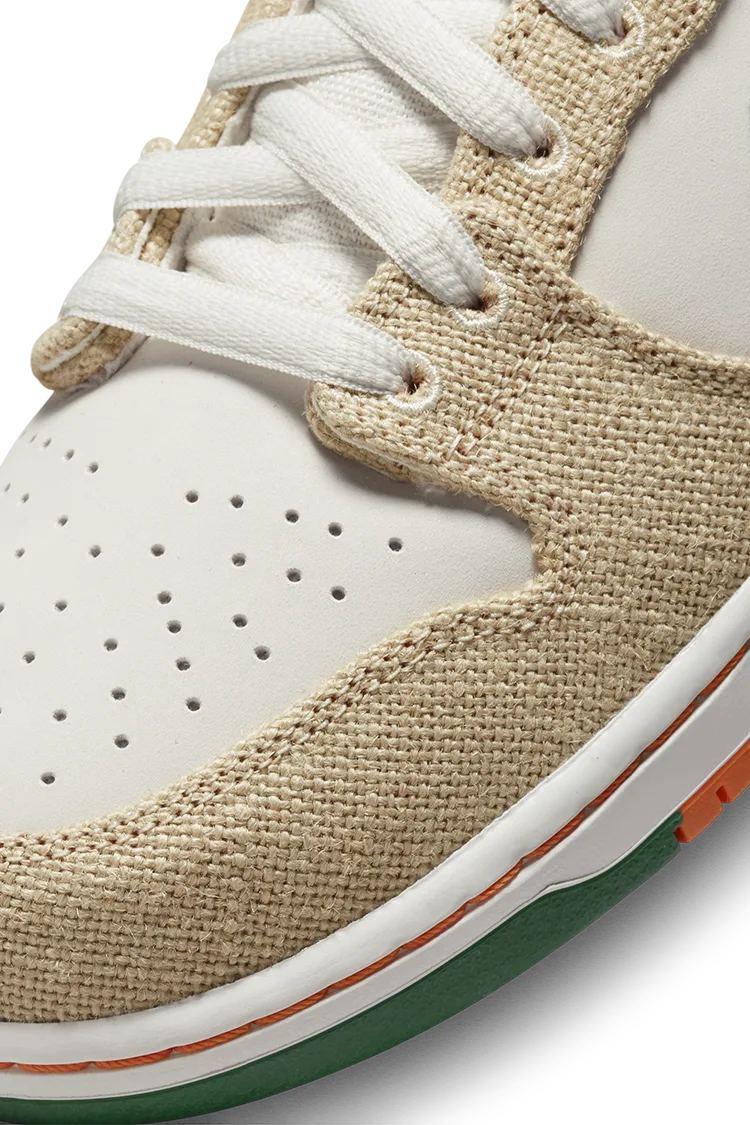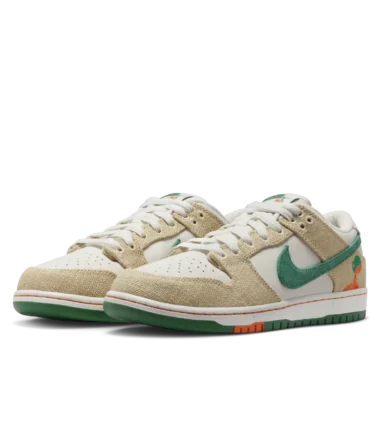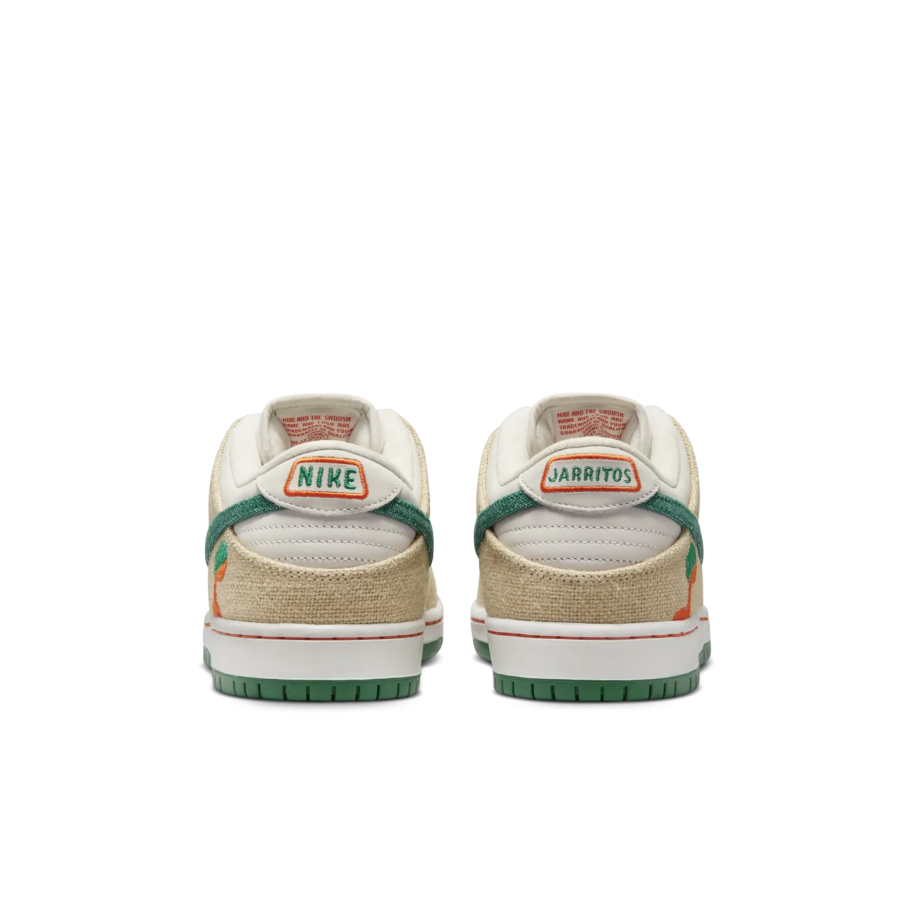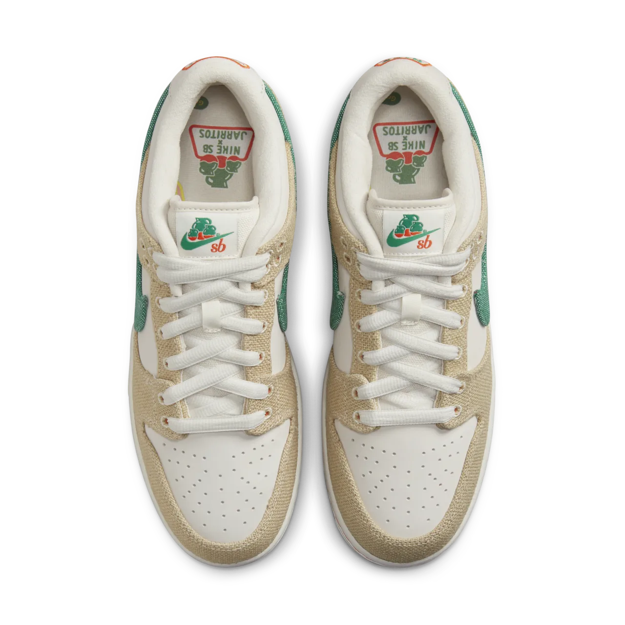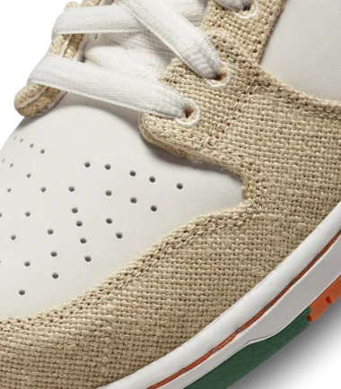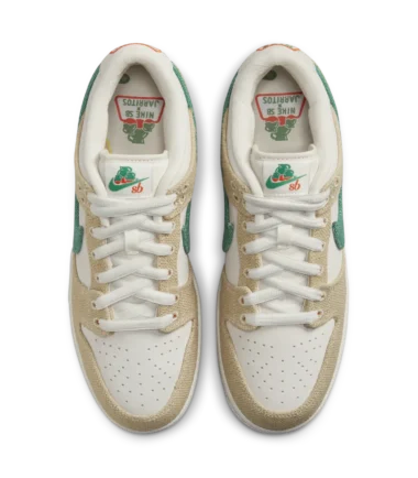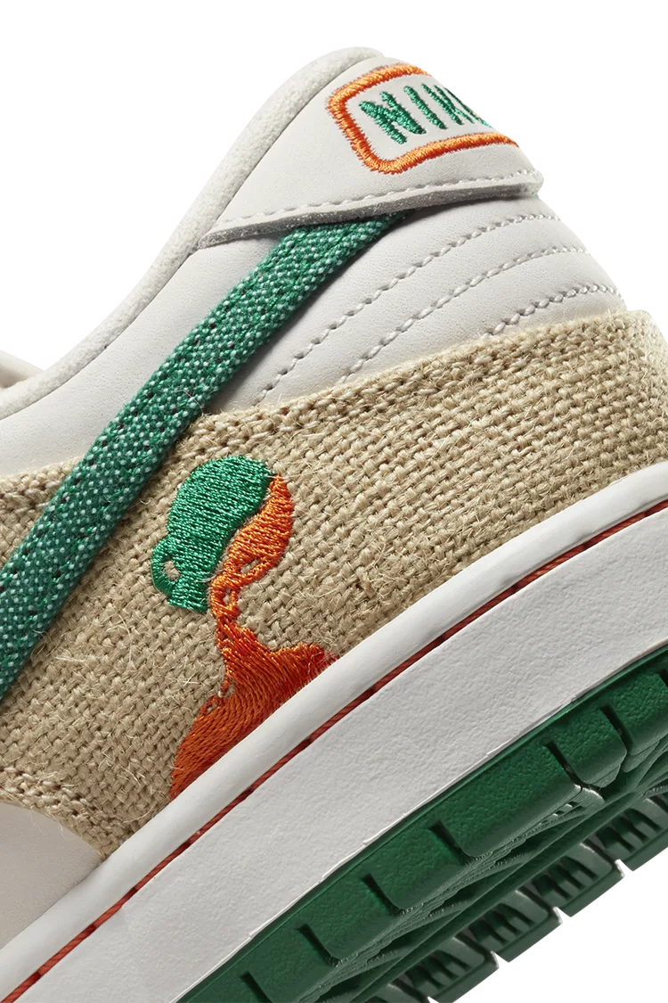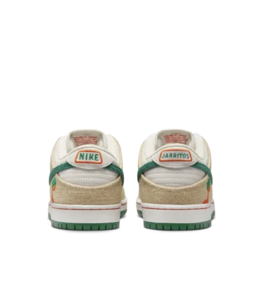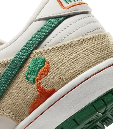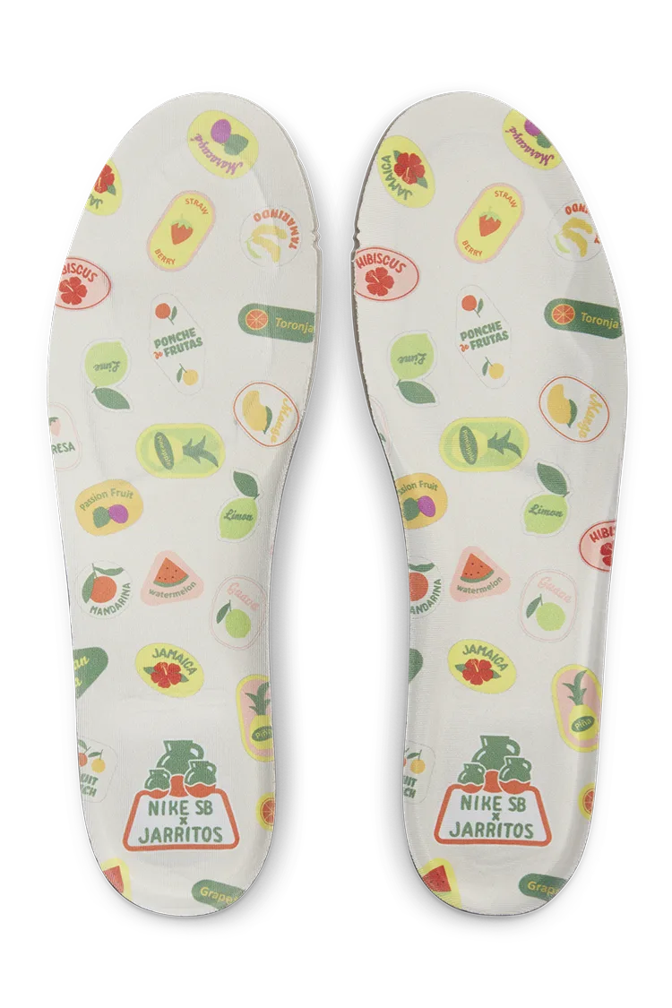 La parte superior de los Nike SB Dunk Low está inspirada en los costales que se utilizaban para cargar las frutas frescas con las que se hacían los diferentes sabores de Jarritos®. Por ello, el material protagonista de estas siluetas es tipo lona que al desgastarse, resalta toques de gamuza naranja que le da un estilo más fresco.
