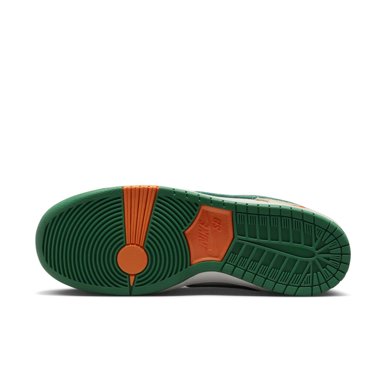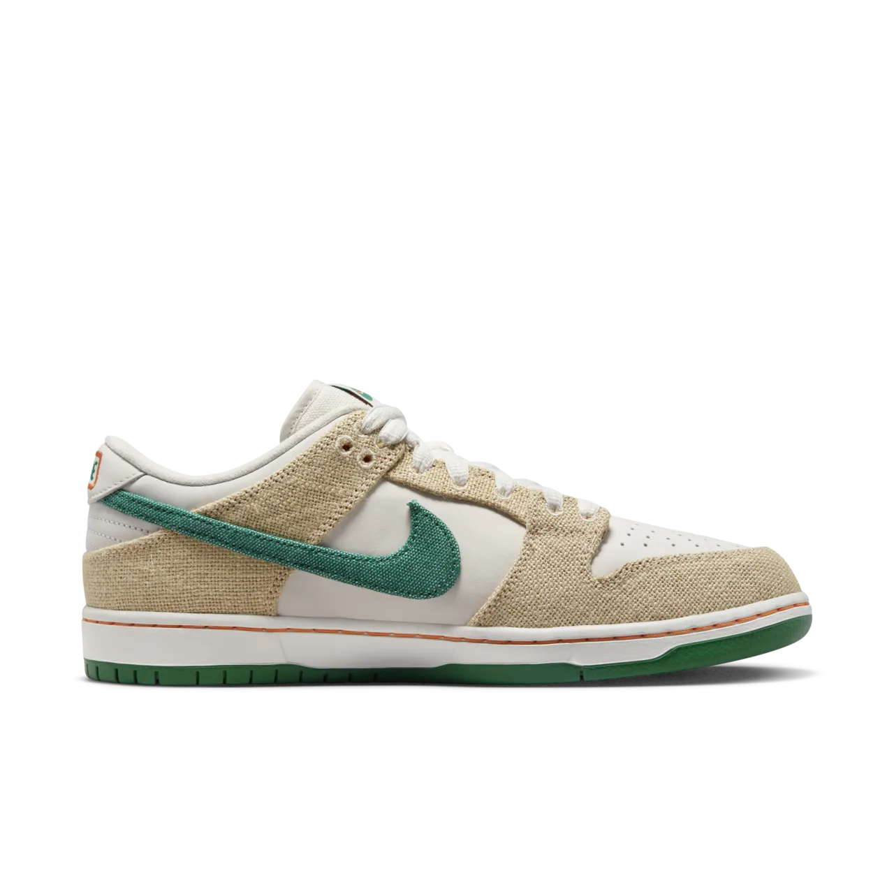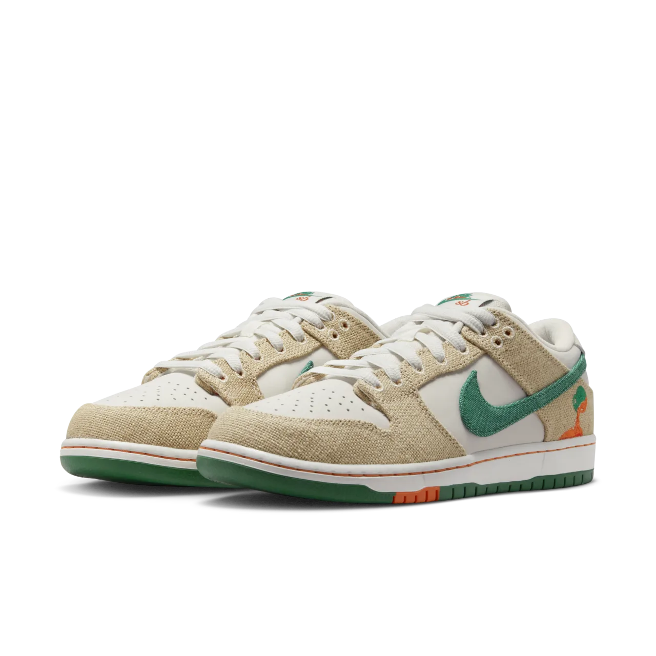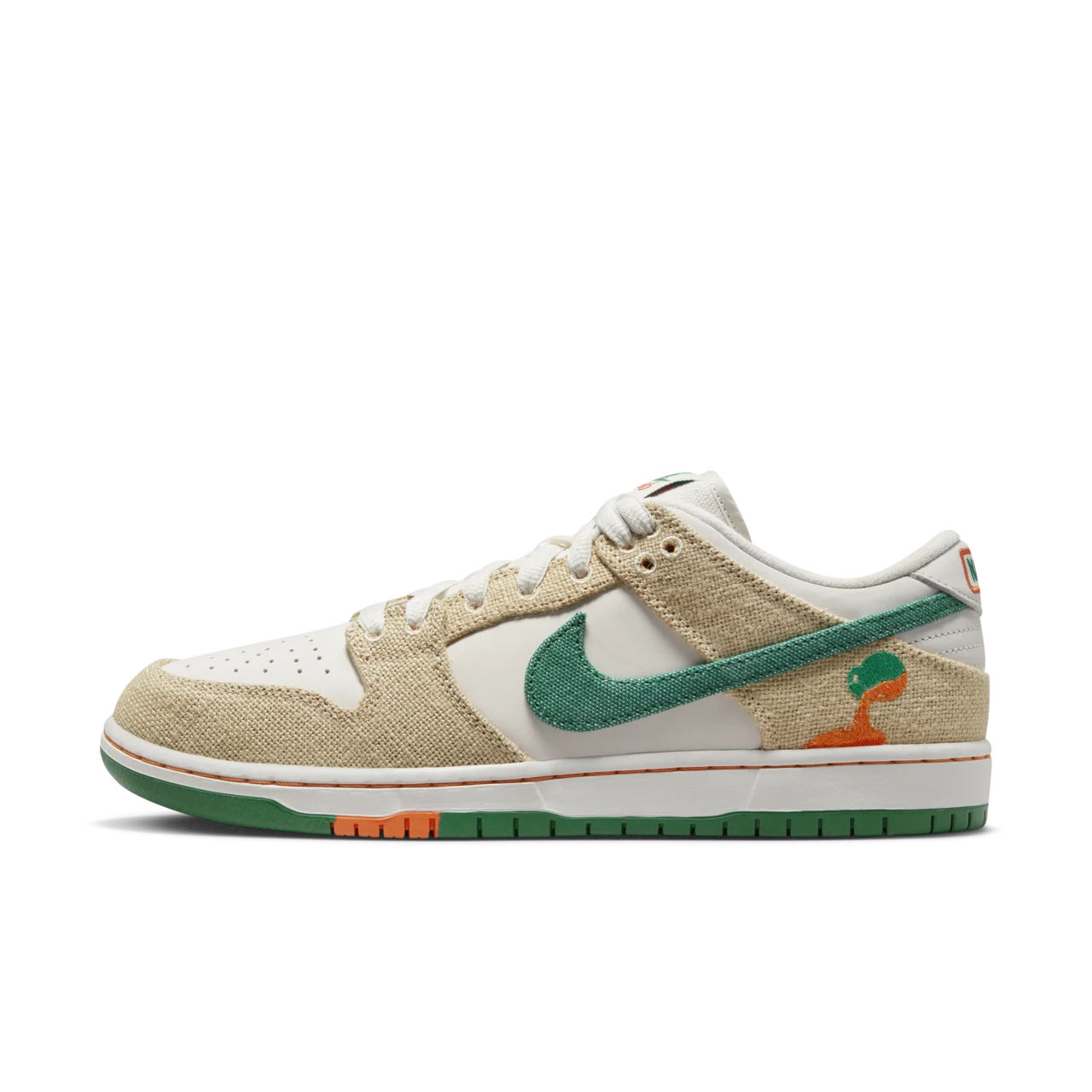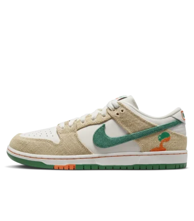 La parte superior de los Nike SB Dunk Low está inspirada en los costales que se utilizaban para cargar las frutas frescas con las que se hacían los diferentes sabores de Jarritos®. Por ello, el material protagonista de estas siluetas es tipo lona que al desgastarse, resalta toques de gamuza naranja que le da un estilo más fresco.
